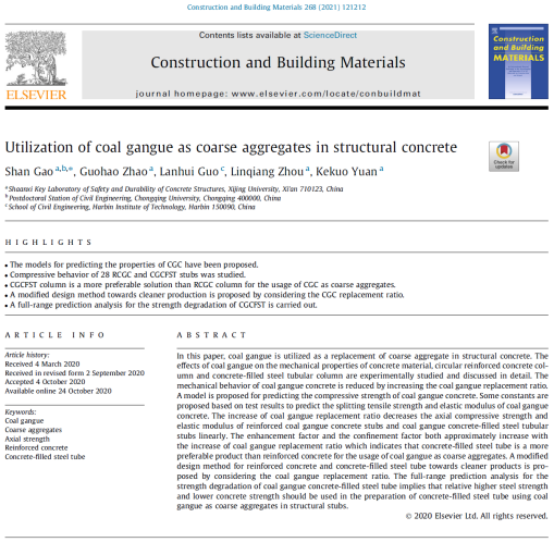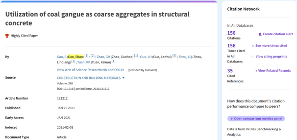 2021年1月在工程材料领域权威期刊《CONSTRUCTION AND BUILDING MATERIALS》(中科院&JCR双一区Top期刊,IF=7.4)发表的学术论文《Utilization of coal gangue as coarse aggregates in structural concrete》入选ESI高被引论文。论文本着减少自然资源消耗的目的,将煤矸石用作结构混凝土中粗骨料的替代品,对煤矸石对混凝土材料、圆形钢筋混凝土柱和钢管混凝土柱力学性能的影响进行了实验研究和详细讨论。