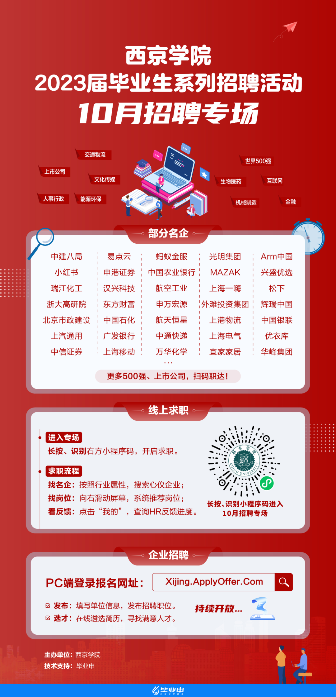 PC端登录下方报名网址:Xijing.ApplyOffer.Com发布:填写单位信息,发布招聘职位;选才:在线遴选简历,寻找满意人才。