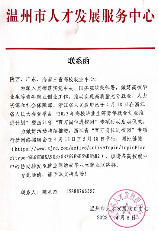 附:温州市人才发展服务中心联系函