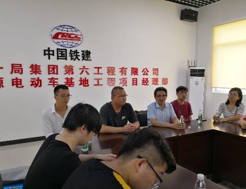 接着来到“中国-东盟新能源电动车基地建设项目部”,企业总经理张永超、何涛、suncitygroup太阳新城傅少君院长以及三位指导老师在项目部会议室进行了详细实习工作部署。张永超总经理首先对工程情况进行了详细介绍,并就相关的安全问题对学生提出了几点要求;傅少君院长从安全、专业知识理论实践、感恩和礼仪等各个方面对学生提出了实习具体要求;实习指导老师结合工程项目安排和学生学习兴趣将学生划分为测量、广联达、BIM、识图和材料5个小组,并明确各个小组的指导教师和组长。在此基础上,对本次实习进行了详尽的规划,并根据企业的工程情况编制了极具针对性的中铁二十局特有实习大纲。