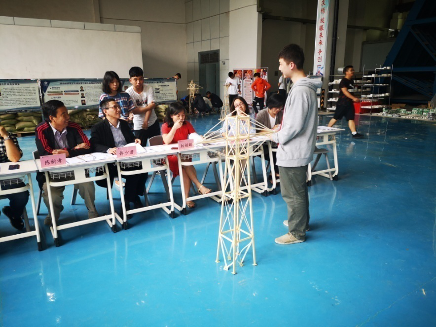 本次竞赛命题为“山地输电塔模型设计与制作”,比赛分为理论方案初选、现场制作(模型制作、理论答辩、模型安装和模型加载)两个部分,其中现场模型制作时间累计长达19小时,通过理论方案初选共有6只队伍进入现场,其参赛队伍分别来自行健书院和至诚书院。理论答辩阶段场面激烈,各参赛队伍对参赛作品进行详细介绍,各评委积极反馈,师生讨论融洽。