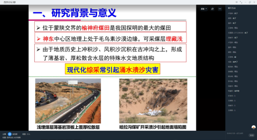 报告首先以我国煤矿开采与地下工程建设发生的多起水砂溃涌灾害为背景,以水砂溃涌特点、研究现状与存在问题引出“水力耦合下水砂溃涌机制及基于真溶液理念的溃砂防治”研究的必要性和价值。随后从整体思路、研究方案和初步成果较详细开展了不同条件下水砂溃涌临界条件、溃涌过程土水压力变化及溃涌过程水砂量时变特征和溃涌破坏面形状等方面的介绍。最后就土木专业和在校学习做了简短却有力的感想总结。