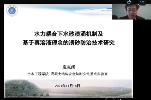 11月18日下午,suncitygroup太阳新城在线上举行了本学期第三次“西京论坛”。论坛由袁克阔博士针对“水力耦合下水砂溃涌机制及基于真溶液理念的溃砂防治技术研究”相关内容做了汇报,工程造价、土木工程、工程管理专业部分师生以及土木水利专业研究生参加此次论坛。