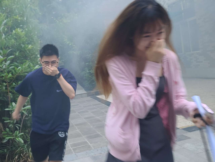 随即进行了火场逃生的演练。拉开烟雾弹,警报响起,1分钟内所有老师和学生迅速有序的撤离火灾现场,在实验室大门口集合,实验室管理老师确认保证所有人员全部撤离火灾现场后清点人数。
