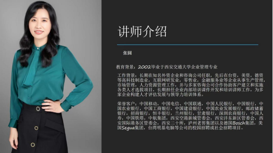 据悉,张圆经理,2002毕业于西安交通大学企业管理专业。长期在知名外资企业和咨询公司任职,先后在台资、美资、德资等高科技制造业、互联网研发业、零售业、金融服务业等企业从事生产管理、市场管理、人力资源管理工作,并与多家咨询公司合作协助客户建立和实施各类人才选拔项目,长期担任企业内部培训课件开发和培训讲师工作,为多家企业构建人才评估发展与领导力培训体系。