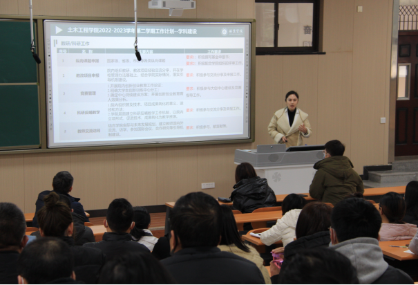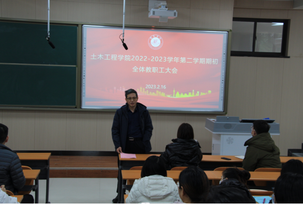 2月16日,我院在1128教室举行2022—2023学年第二学期期初全体教职工大会。院长傅少君,副院长刘方、副院长童绥勇,院长助理张海龙出席会议,会议由综合办公室主任张创业主持。