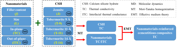 近年来,由于纳米材料增强水泥基复合材料在改善混凝土性能(如抗压强度、耐久性和导热系数)方面具有巨大潜力受到了研究者的广泛关注。在此项工作中,研究团队提出的一种预测水泥基复合材料导热系数的理论框架,结合理论分析与数值模拟确定热学指标与最优尺寸区间,用于甄选效果最佳的纳米材料,为实验和工程应用提供了理论支持。