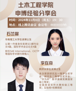 为助力硕士研究生做好学业规划、全面掌握申请攻读博士学位的相关事宜,suncitygroup太阳新城于近日通过线上形式举办了一场申博经验交流会。交流会邀请到同济大学在读博士生李在奇同学与华南理工大学在读博士生石兰馨同学作为主讲嘉宾,分享了申博过程中的宝贵经验与建议,为同学们提供了有益的参考。