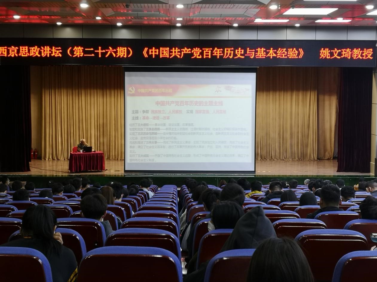 为全面了解、正确认识和认真学习党的历史,牢记初心使命、推进中华民族伟大复兴的历史伟业,3月25日下午,西京思政讲坛开讲了。马克思主义学院邀请了原中共陕西省委党史研究室原巡视员、陕西省延安精神研究会副会长、现西北大学特聘教授、全国党史系统领军人物姚文琦研究员,在小礼堂做了题为“中国共产党百年历程与基本经验”的学术报告,马克思主义学院全体教师与万钧书院的学生参加了本次报告会。报告会由马克思主义学院王琪副教授主持。