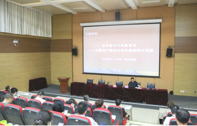 杨洪教授以《百年奋斗与民族复兴——中国共产党对中华民族的伟大贡献》为题,从中国共产党的诞生是近代中国历史发展的必然、中国共产党是民族解放的领路人和新中国的缔造者、中国共产党是新时代实现民族复兴的设计师和领航者等四个方面全面解读了中国共产党对中华民族的伟大贡献。他指出:我们要坚持以习近平新时代中国特色社会主义思想为指导,增强“四个意识”、坚定“四个自信”、做到“两个维护”,听党话、感党恩、跟党走,从党的百年历史中汲取信仰、信念、信心的智慧和力量,以优异成绩向党的百年华诞献礼。