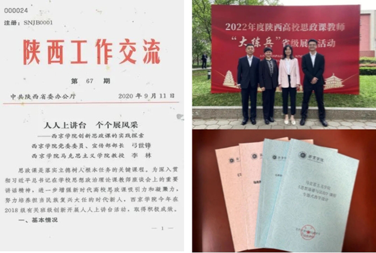 ——示范引领,创新思政育人教学模式。示范引领,创新思政育人教学模式。在教学实践中,我校不断深化课程思政与思政课程的教学改革,推动思政课教材体系向教学体系的有效转化。在思政课教学内容上,学校积极推动专题式问题链教学改革,编写了思政系列主干课程专题式问题链教学设计,使教学内容更加凝练、更具针对性。在教学方法上,积极运用案例教学、小组研学、情景展示、课堂辩论等多元化教学方式,激发学生的学习兴趣和主动性。其中,《人人上讲台,个个展风采——我校创新思政课的实践探索》被中共陕西省委办公厅主办的《陕西工作交流》刊发,并在全省、市和县区推广,思政课教学改革成效受到省级领导部门充分肯定。